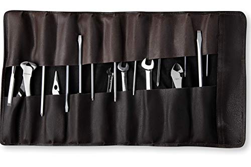 • SPACE SAVING AND PRACTICAL: This leather Tool Bag has a roll up design with a strong “hook and loop” metal ring buckle and extra-long leather straps to ensure a secure close and maximum adjustability. With its compact design and leather carry handle, our Tool Organizer is versatile and portable enough to be packed into a motorbike saddle bag or backpack. SIZE when flat: 25.5 x 13.7 inches.